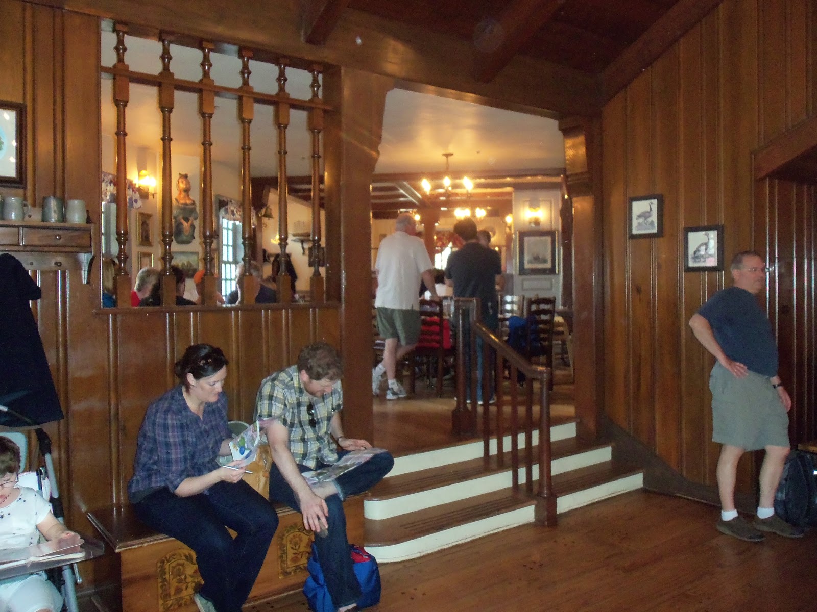 Laura checked us in, told us it would be a bit because there were several parties ahead of us, and invited us to sit in the rocking chairs that were placed around the foyer. Sounded good to me, so I sat down and started rocking. Jared began cataloging his new trading cards, while I just rocked and watched the crowds outside move back and forth.
